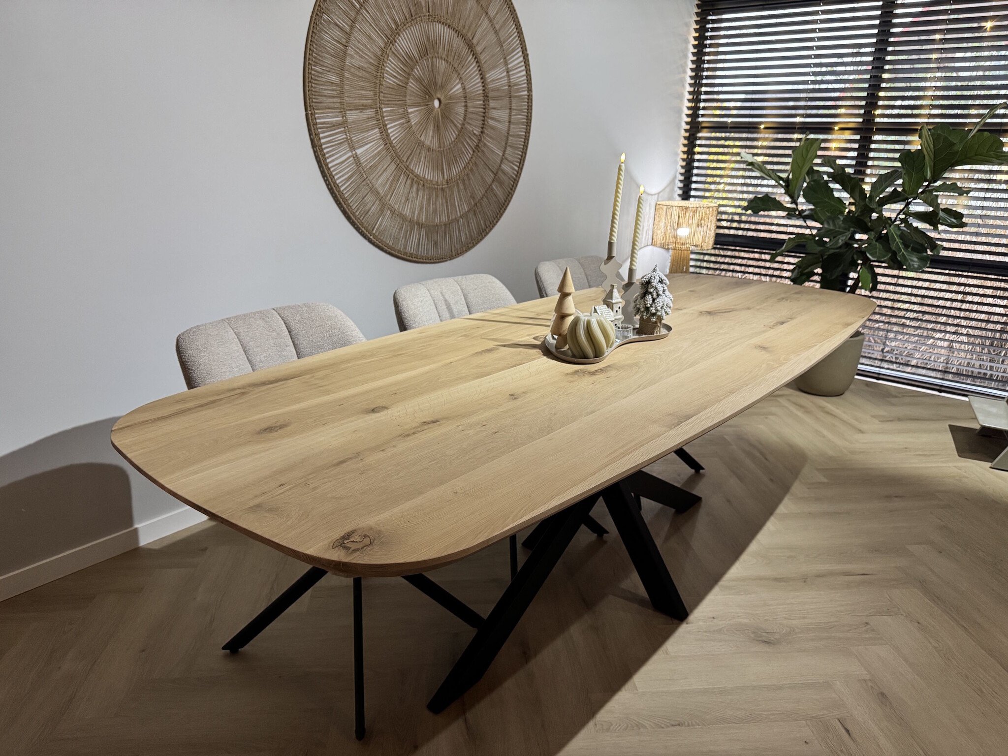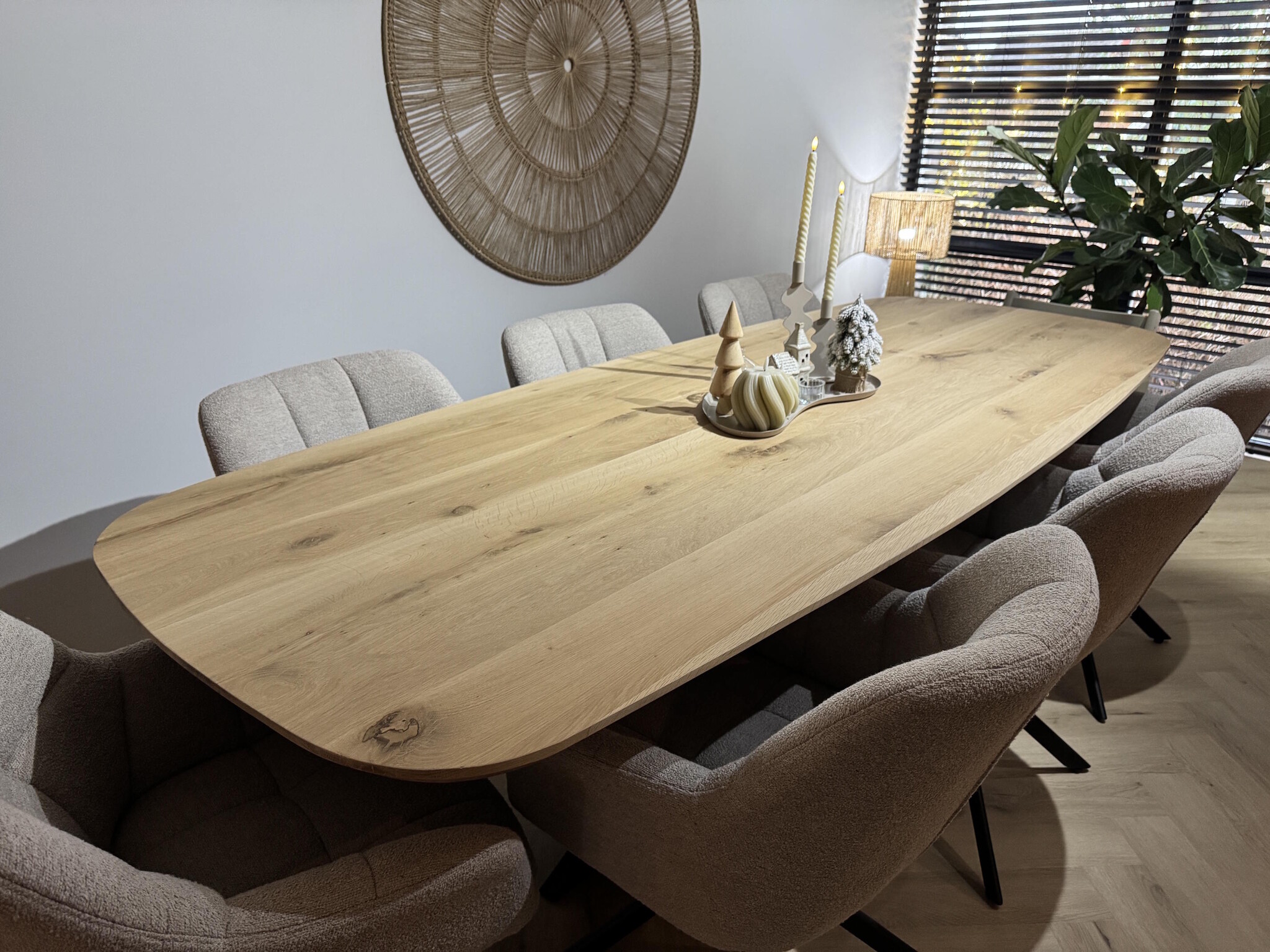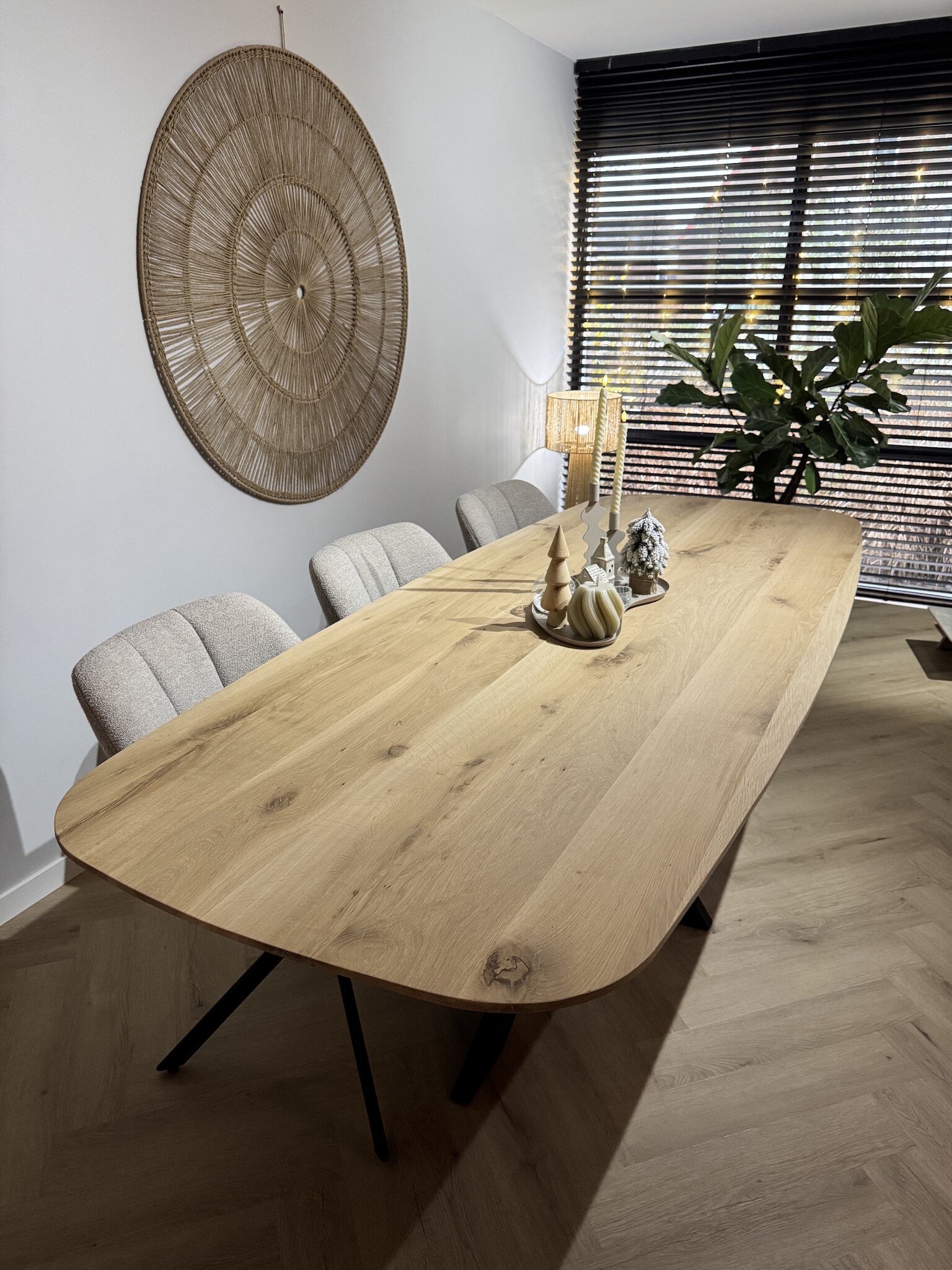 Het massieve eikenhout is 4 cm dik en geeft elke eettafel een uniek karakter, met natuurlijke nerven en warme kleurtinten die in de loop der tijd alleen maar mooier worden. De Eiken eettafel is bovendien verkrijgbaar in verschillende maten, zodat hij perfect aansluit bij zowel compacte eetkamers als royale leefruimtes. Het Deens ovale blad heeft een rechte of een verjongde rand van 45 of 60 graden, dit kan je eenvoudig zelf aangeven in de bestelopties.