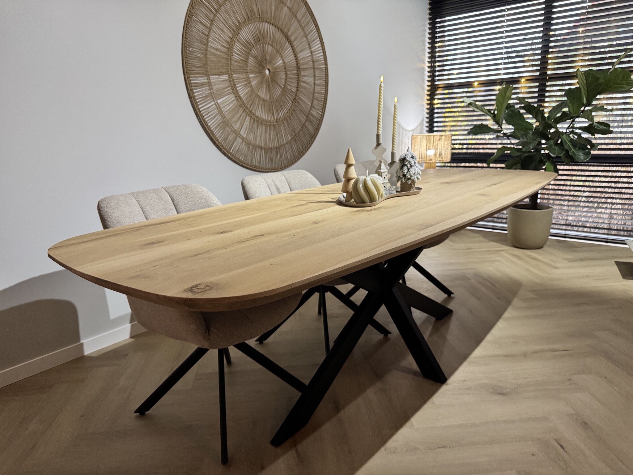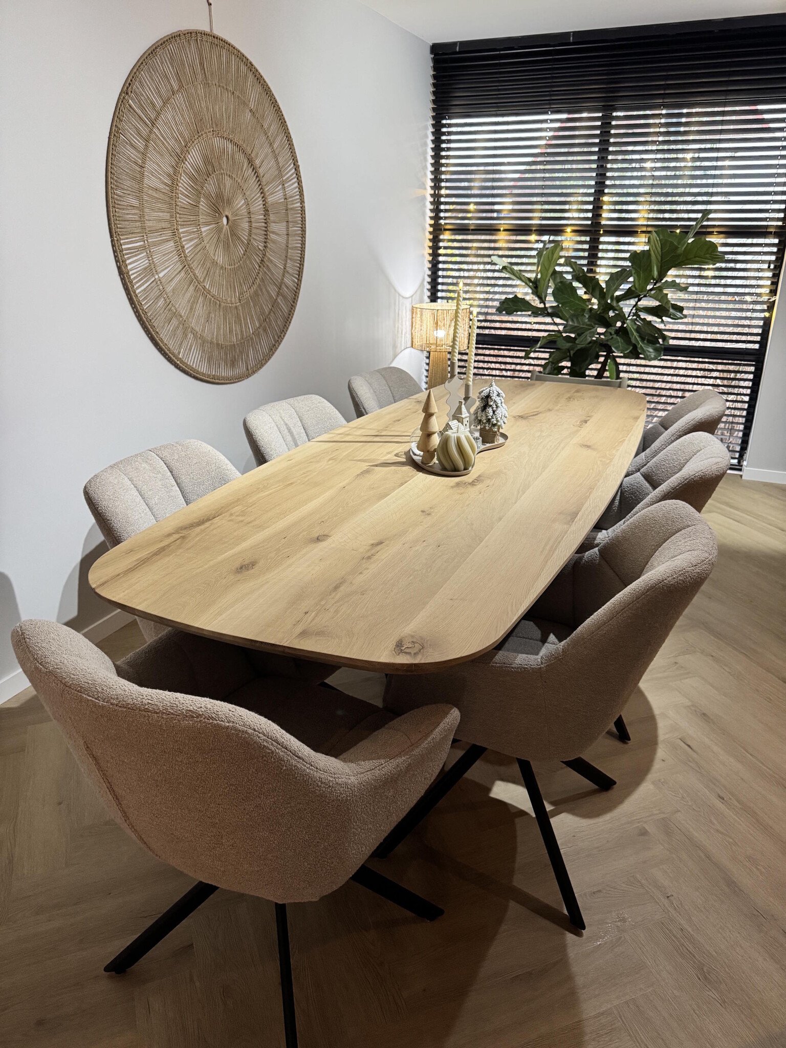 Deze stijlvolle Eiken eettafel is een perfecte balans tussen elegant design en robuuste kwaliteit. Het massief eiken blad heeft een verfijnde Deens ovale vorm, wat zorgt voor een zachte, organische uitstraling in je interieur. Dankzij de afgeronde lijnen oogt de tafel ruimtelijk en uitnodigend, terwijl er tegelijkertijd voldoende plaats is om uitgebreid te tafelen met familie en vrienden.